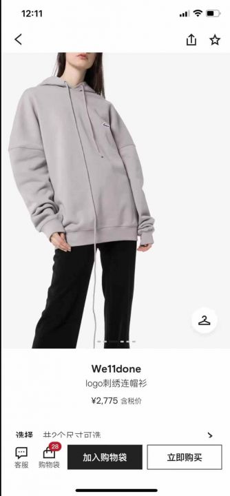 潮牌WE11DONE刺绣logo抽绳连帽卫衣