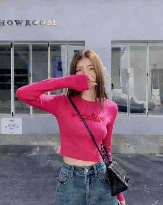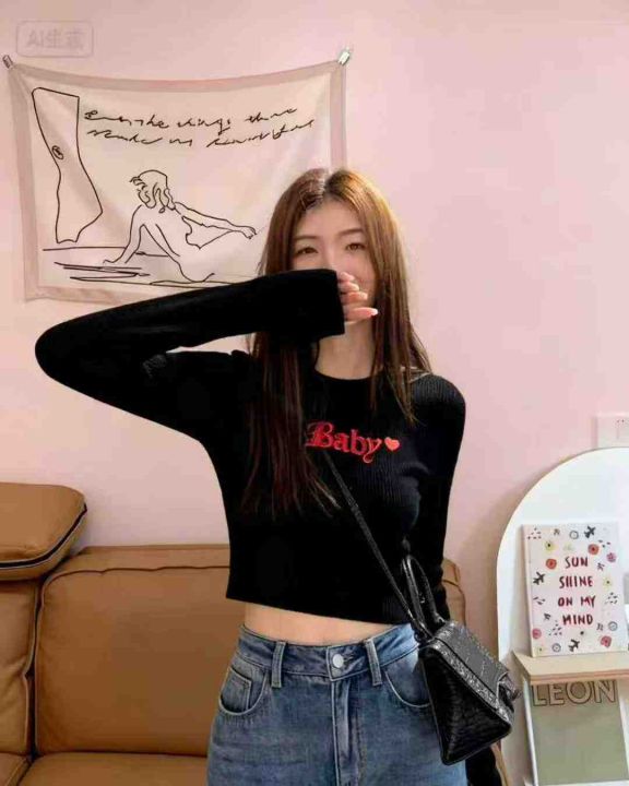 秋季新品纯欲甜辣短款字母刺绣针织长袖圆领套头毛衣,...