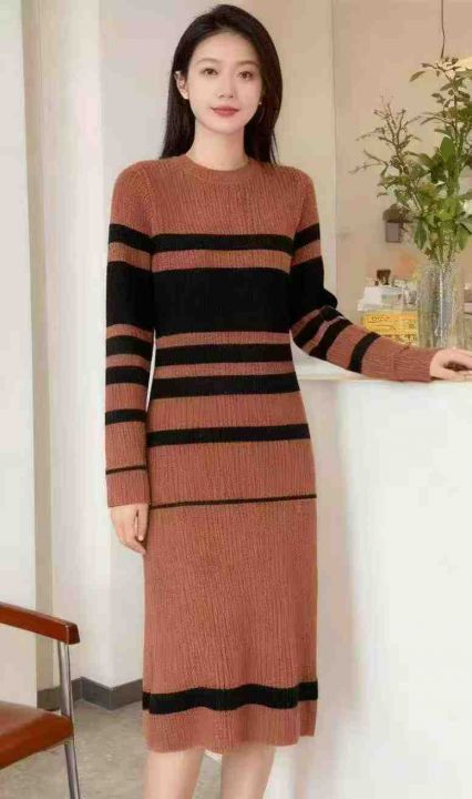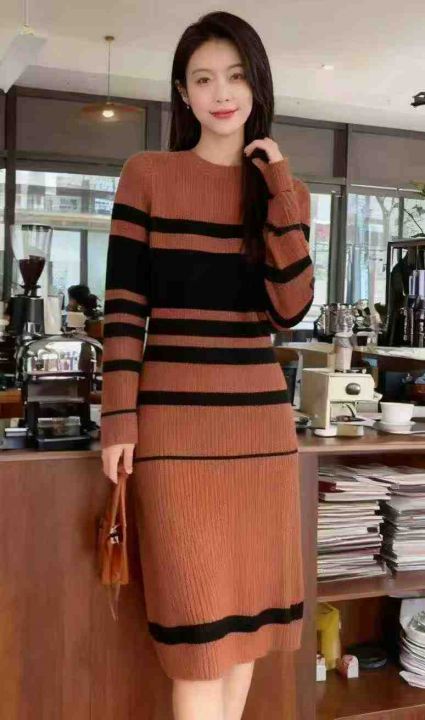 秋冬新款法式复古撞色条纹针织毛衣连衣裙,独立包装,...