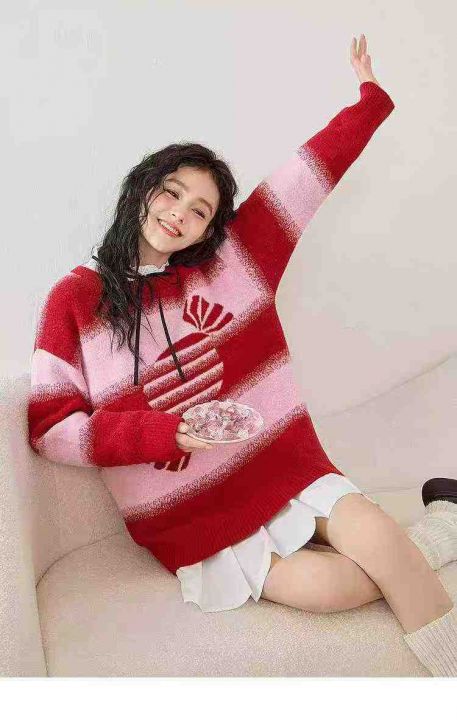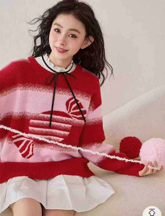 秋冬新款宽松慵懒风乐町草莓奶糖新年红氛围感包芯纱提花钻进套头毛衣,独立包装,均码面料软糯厚实,300件,全清9.9元超低价秒杀!分货加一!