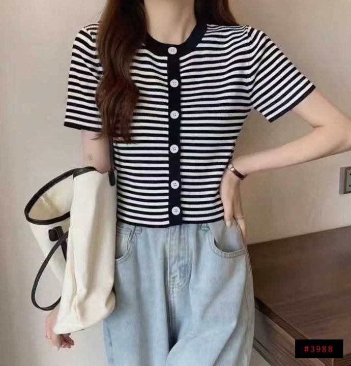 夏季新款撞色条纹冰丝曲珠针织短袖开衫,独立包装,均码面软糯舒适弹力大,...