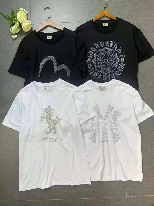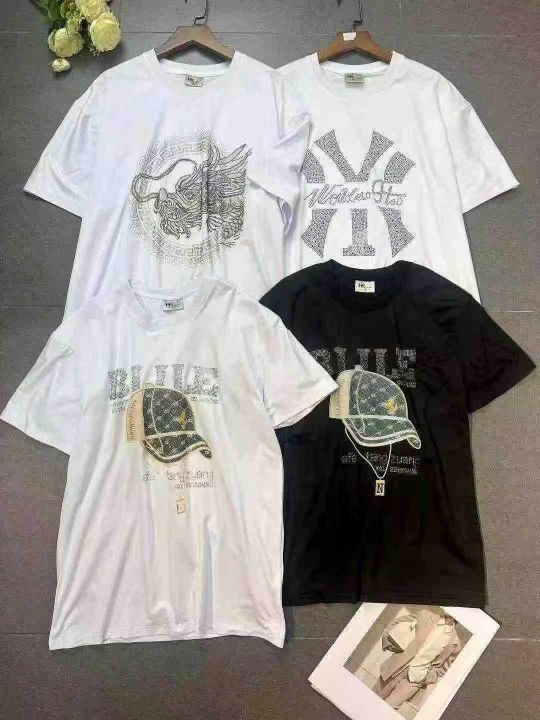 夏季新款精梳棉男女潮流宽松烫钻印花短袖T恤,面料舒适,后领包边到肩,时尚潮流显年轻[得意]独立包装、大货有百分之二十没有烫钻,只有印花、配货要按比例出,洗水唛写精梳棉,摸起来手感像牛奶丝,100件起多款混配10.3