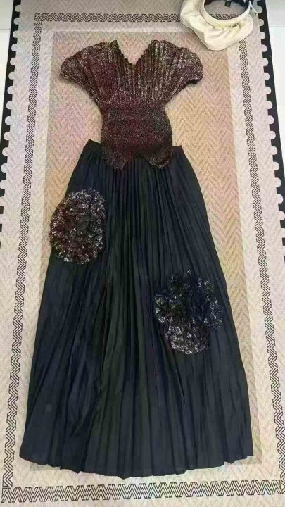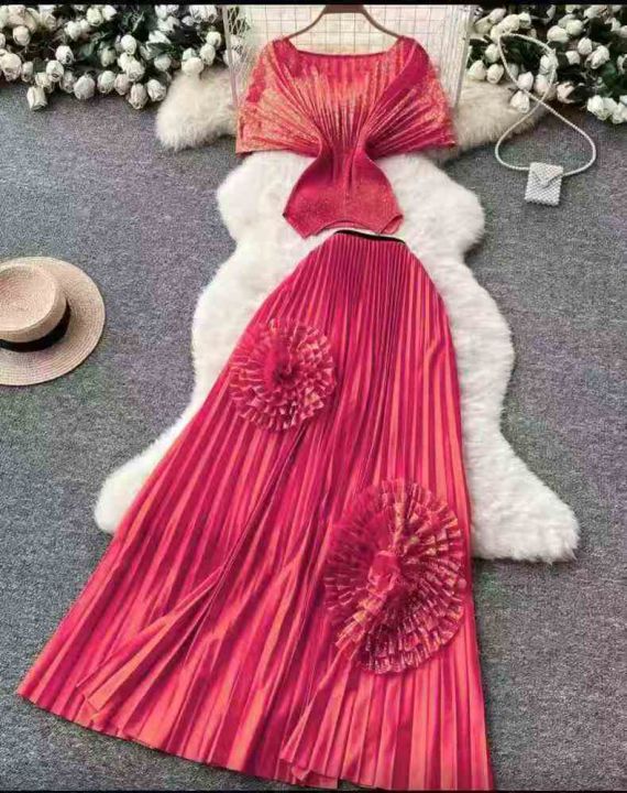 75套左右三宅轻奢重工烫金大盘花长半裙褶皱两件套收腰短袖蝙蝠衫两件套!均码,图片颜色!高弹力!做高货的来!独立包装!全清48.8