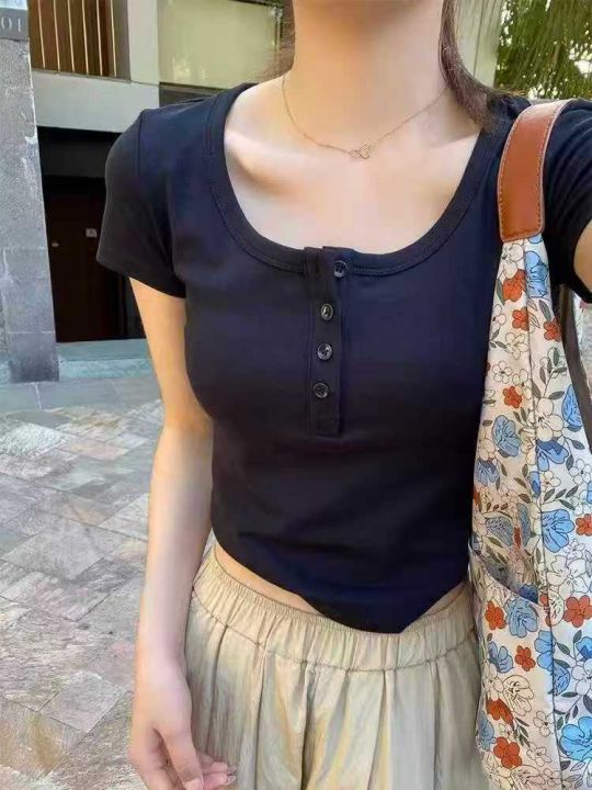 辣妹T恤800件全清13.8元,分货14.8元,均码 黑色 杏色多,个别有宝蓝 深灰,纯棉高弹力,新款新货法式U领正肩短袖t恤女夏季设计感小众别致独特短款显瘦甜辣妹上衣