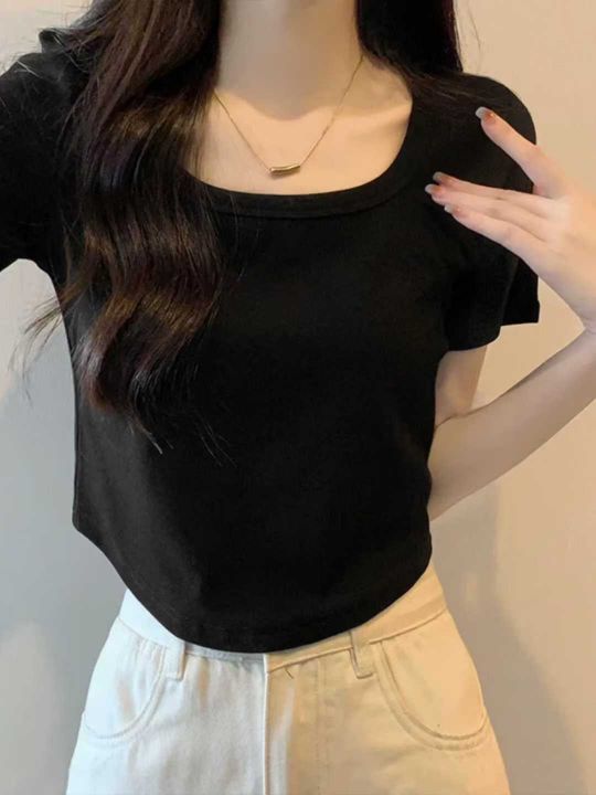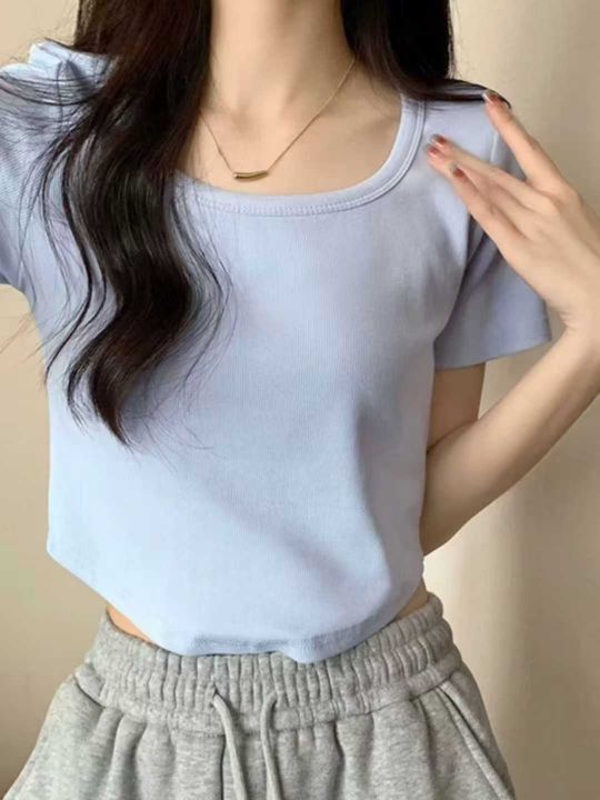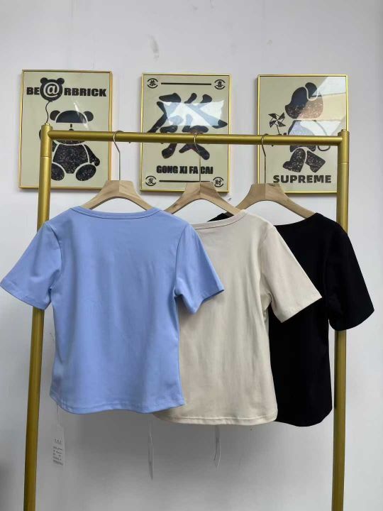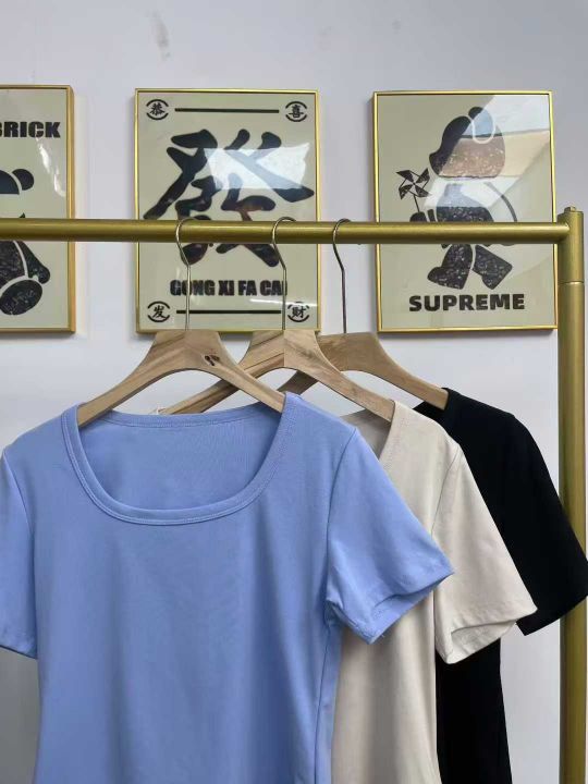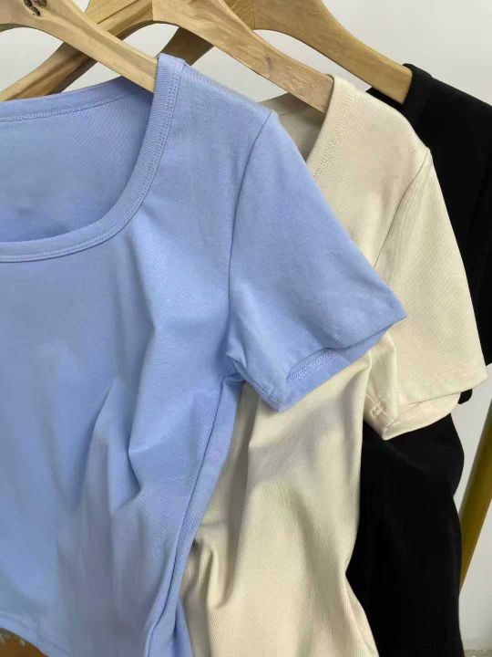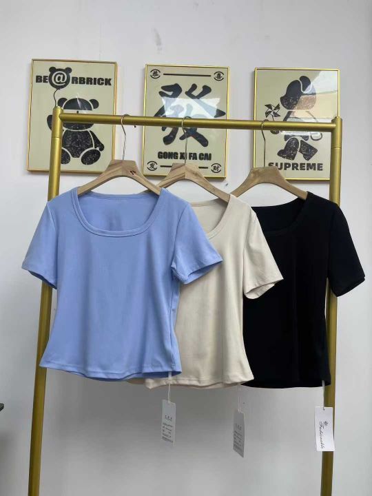 天猫在售款700件左右高品质夏季薄款方领螺纹纯棉靓妹短袖T恤,下摆弧形面料柔软高弹力,单款3色(杏色,蓝色多)S-XL,独立包装带吊牌
