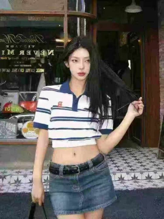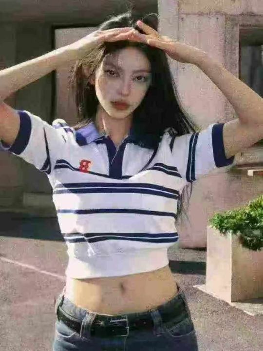 全清价5.9元正肩短袖t恤女短款辣妹小众条纹翻领polo衫...