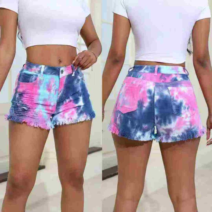 7.8清欧美高腰扎染流苏破洞毛边修身直筒短裤,整款两色,数量135条左右,码...