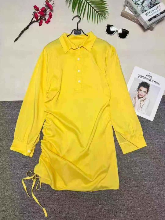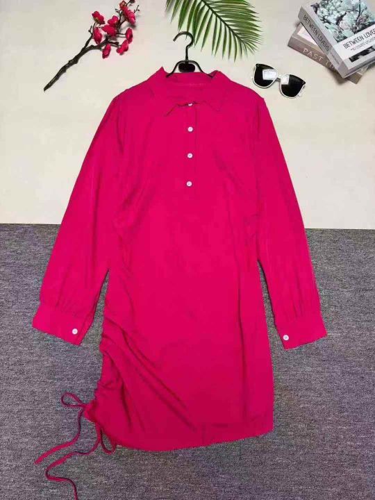 欧美时尚新款侧边抽绳纯色中长款衬衣连衣裙,数量1100条,码数S-XL,整款多色,侧边有拉链设计,品质好,有独立包装。