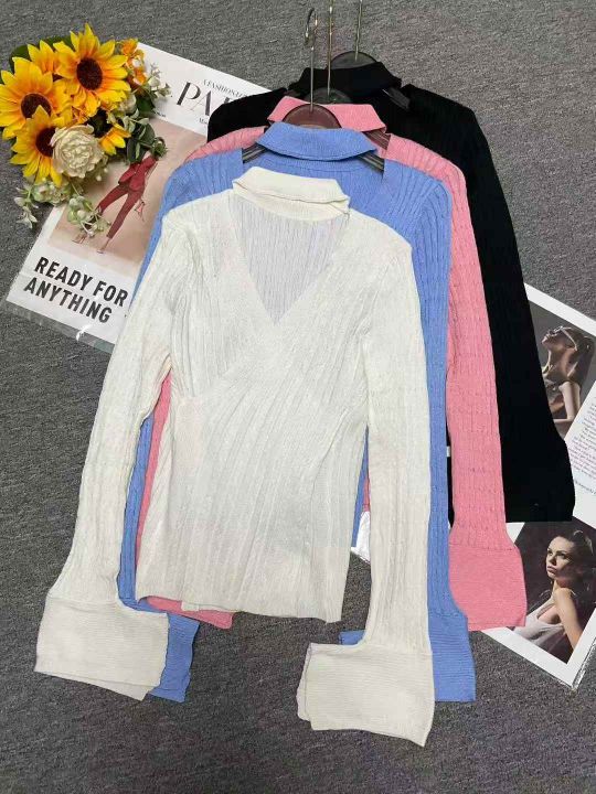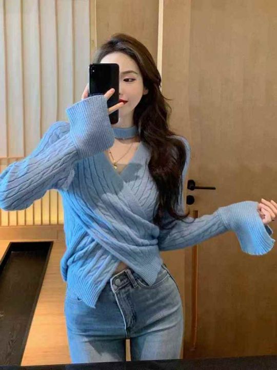 秋冬新款纯欲性感挂脖别致独特设计感小众转花针织套头...