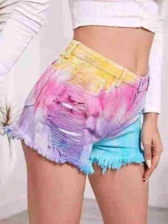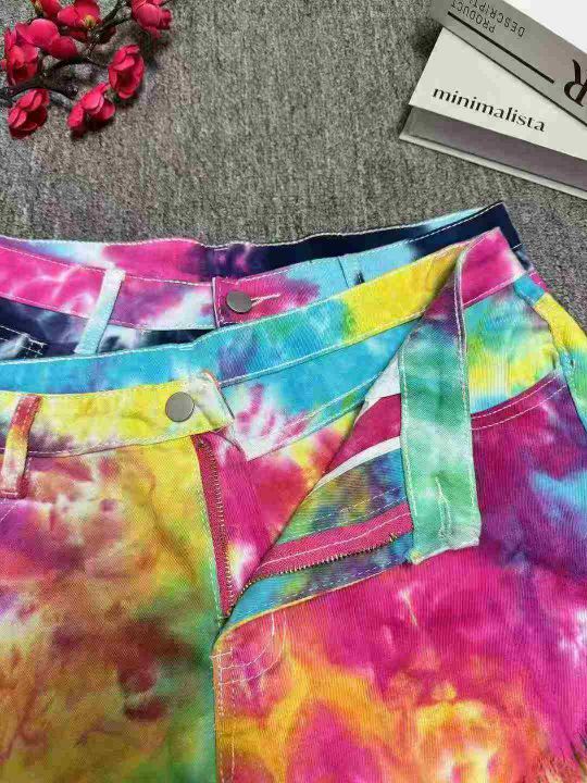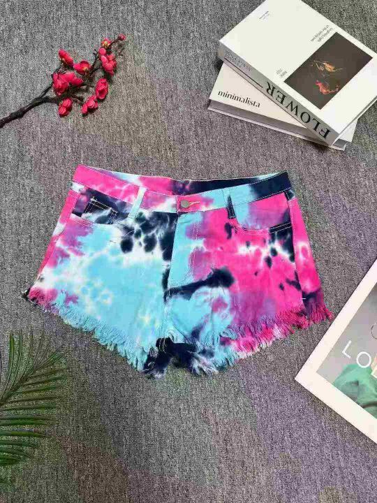 欧美高腰扎染流苏破洞毛边修身直筒短裤,整款两色,数量135条左右,码数S-2XL,品质好,有独立包装。