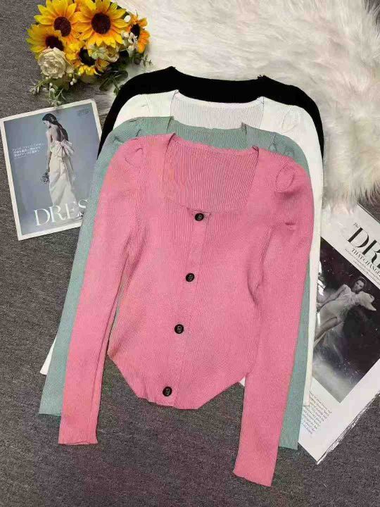 秋冬新款 弹力修身显瘦小香风气质方领排扣弧形泡泡袖针织套头毛衣,独立包装,均码面料软糯舒适弹力大,672件,全清6.9元超低价秒杀!分货加一!