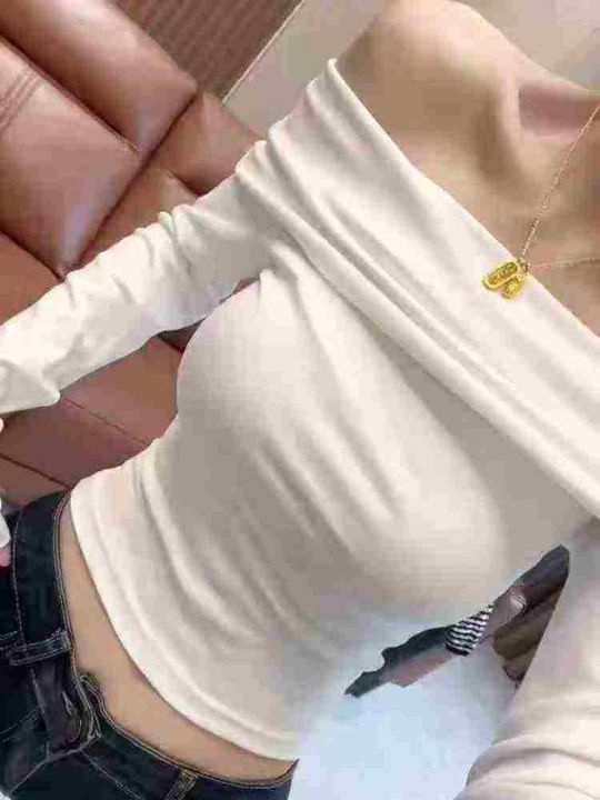 4.5清152件女靓妹辣妹性感一字肩褶皱长袖上衣女秋季短款修身显瘦气质百搭T恤 码数S-M-L 独立包装