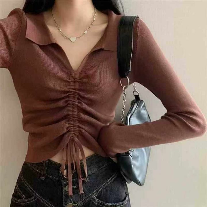 秋季新款韩版复古网红抽绳绑带设计款Polo领长袖针织套...