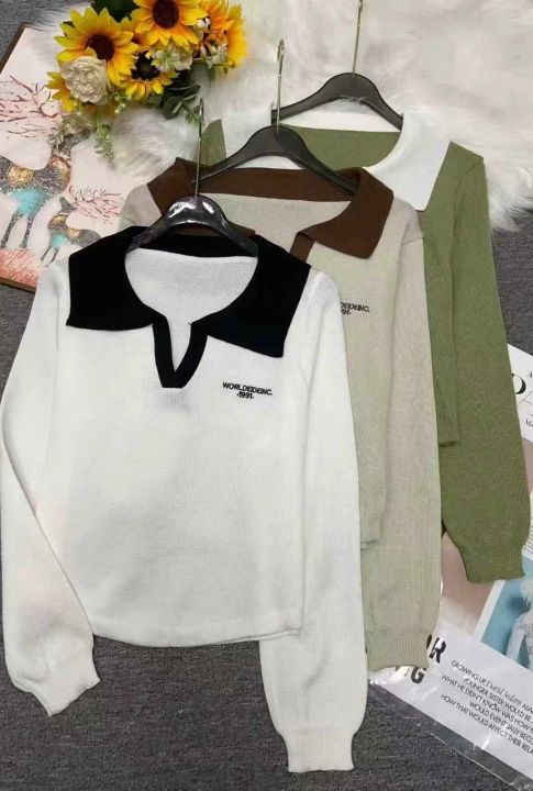 秋季新品撞色刺绣字母小清新百搭polo领针织套头毛衣,...