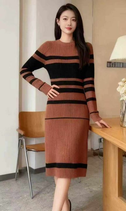秋冬新款法式复古撞色条纹针织毛衣连衣裙,独立包装,...