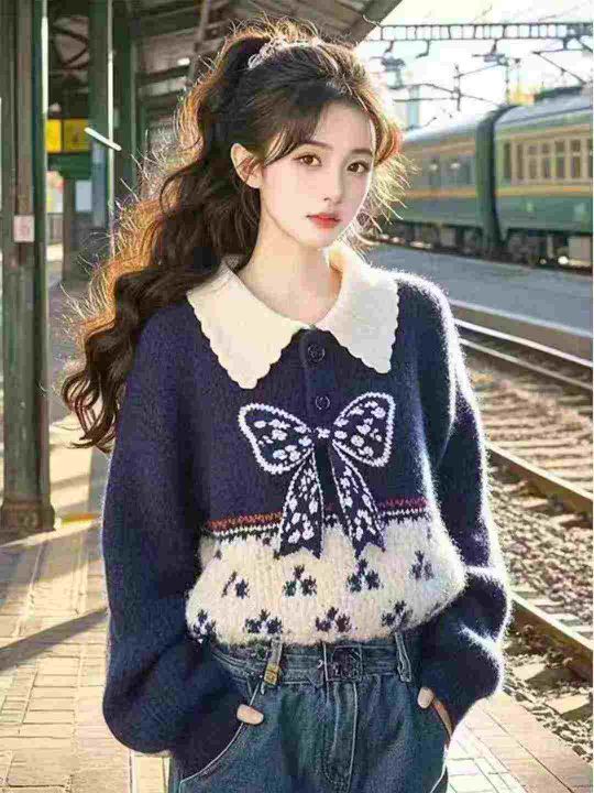 全清12.9,小个子慵懒高级感独特漂亮韩系奶呼呼软糯藏青色针织POLO衫女秋冬,单款单色,均码11件,不分货。