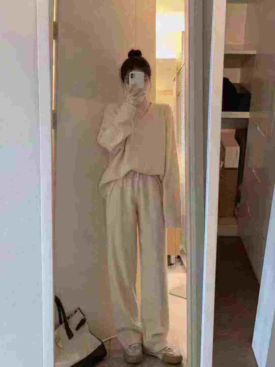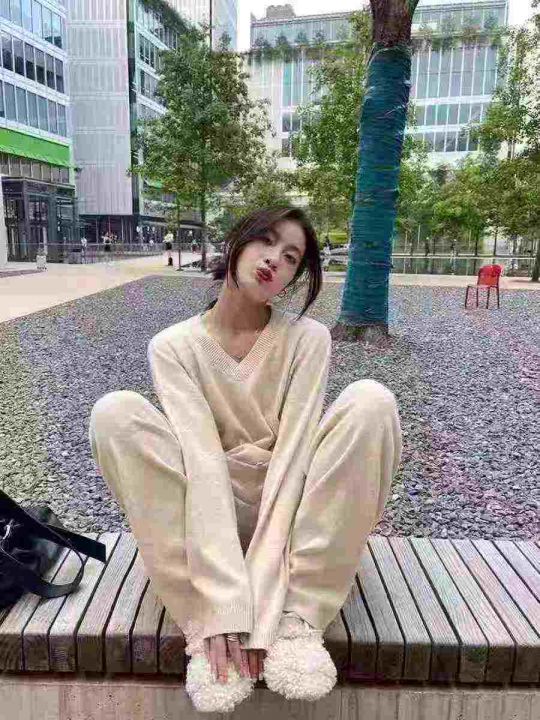 全清22.8,UM休闲慵懒羊毛针织套装女秋冬2025新款V领毛衣阔腿裤时尚两件套,单款单色,均码24套,不分货。