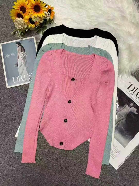 秋冬新款 弹力修身显瘦小香风气质方领排扣弧形泡泡袖针织套头毛衣,独立包...