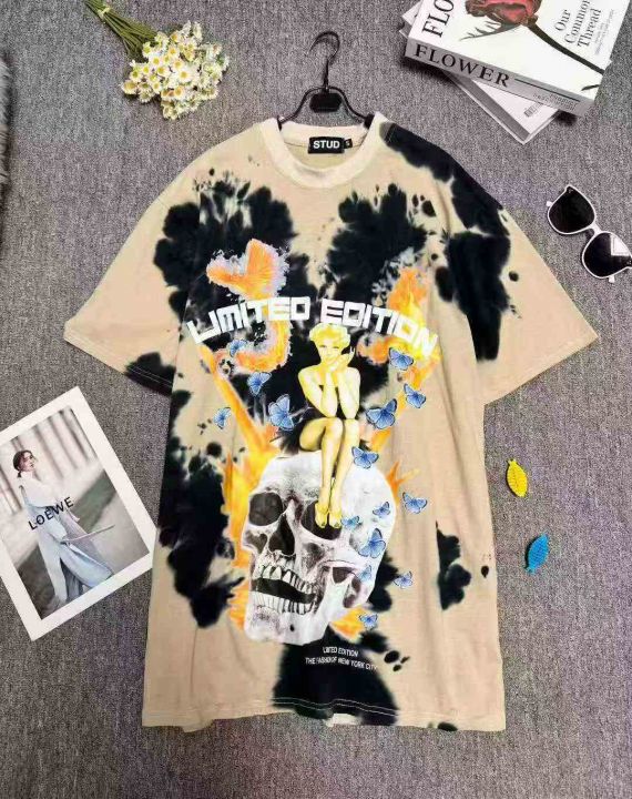 高街闪电骷髅裸洗水做旧复古宽松情侣短袖纯棉t恤,领口有包边,品质好有独立包装,数量380件左右,S-XL,全清5.8,分货+1