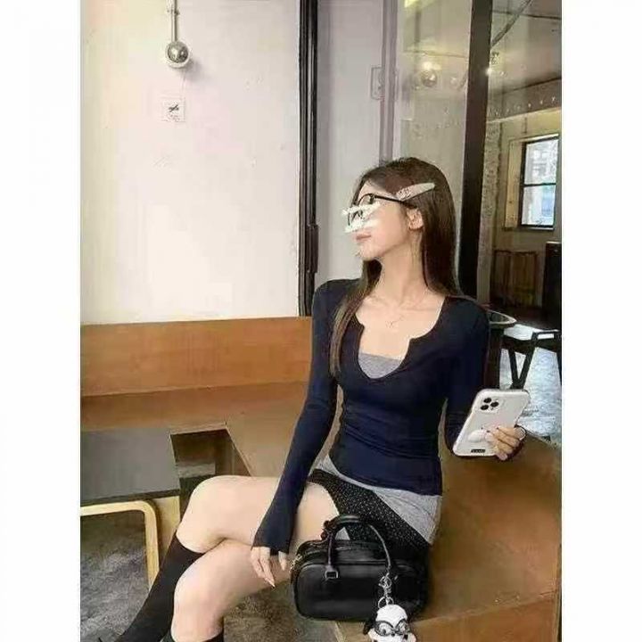 ️6180件\'美式甜辣妹韩版假两件长袖t恤女春夏修身打底衫撞色纯欲显瘦上衣,独立包装,码数M-2XL,全清5.8元\'分货➕0.5