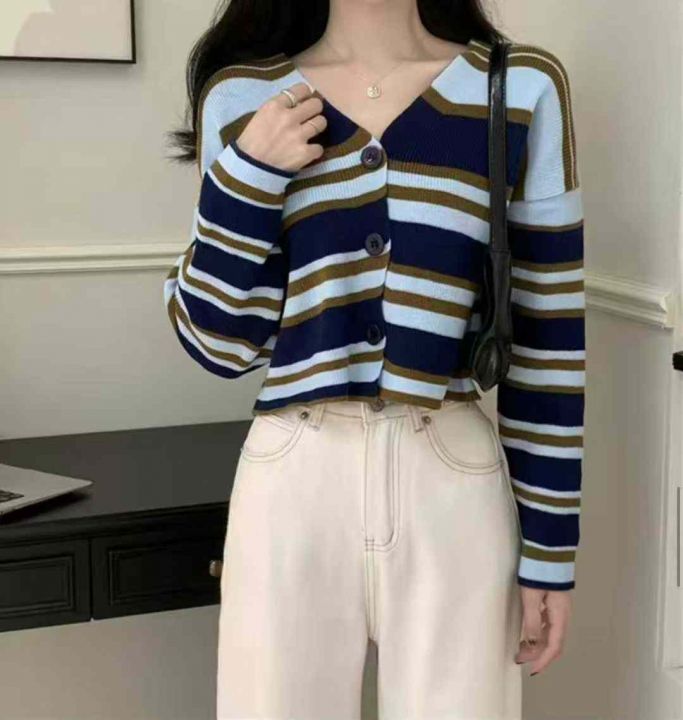 秋季新品软糯撞色条纹宽松慵懒风百搭针织毛衣开衫,独...