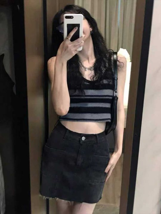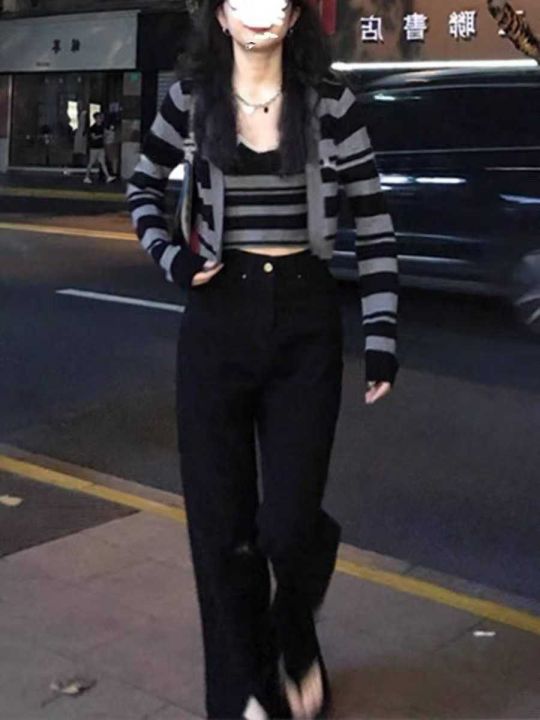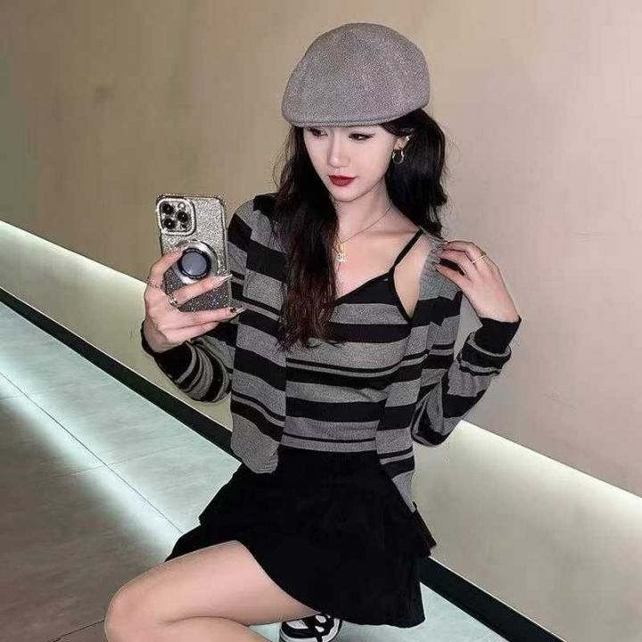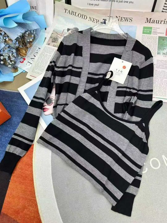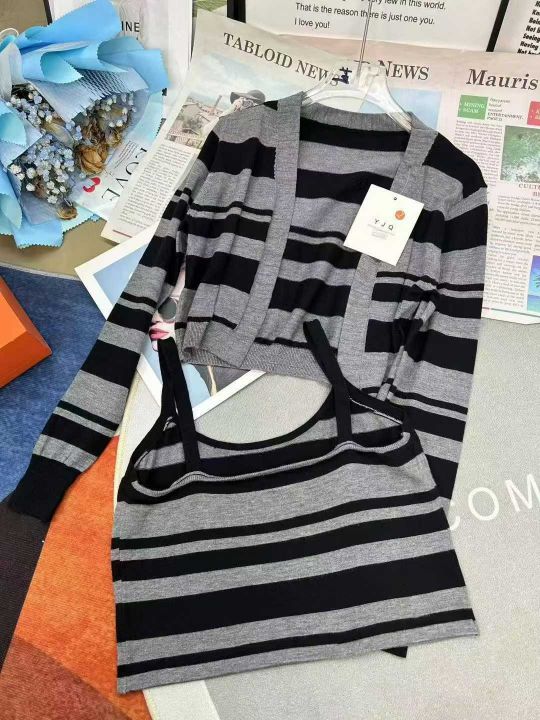 盐系条纹复古炸街辣妹套装开衫外套+背心吊带两件套,...