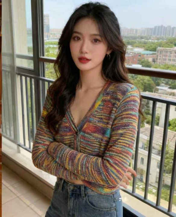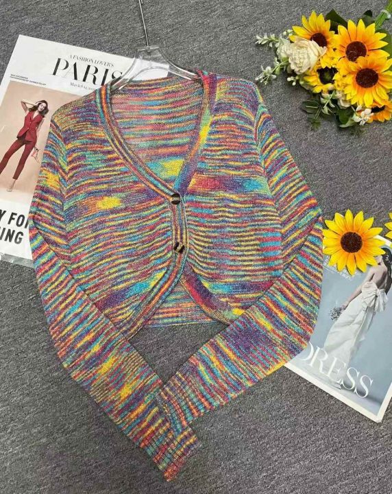 秋季新品宽松花纱撞色彩虹超好看针织毛衣毛衣开衫,独...