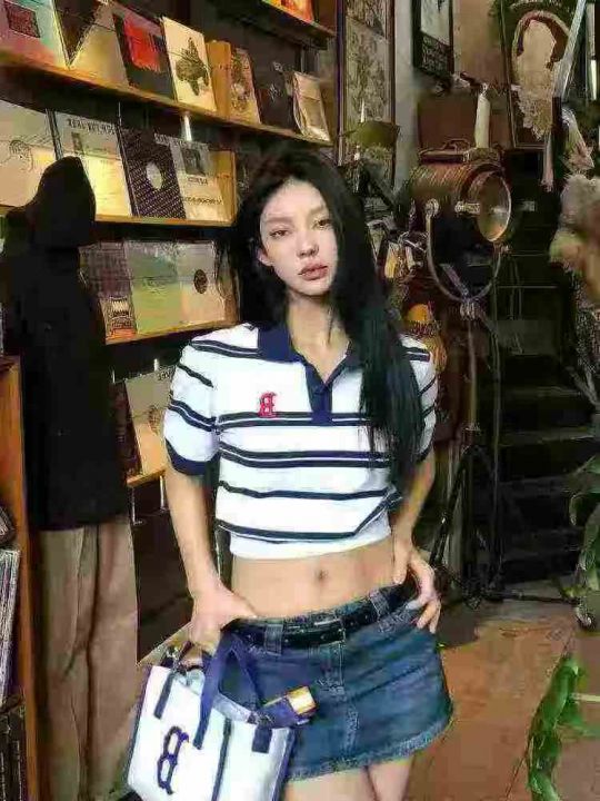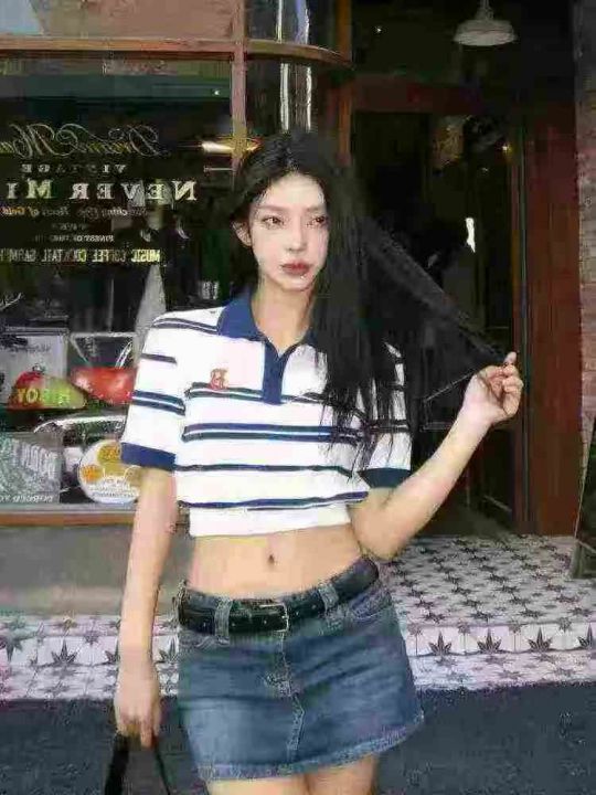全清价5.9元正肩短袖t恤女短款辣妹小众条纹翻领polo衫...