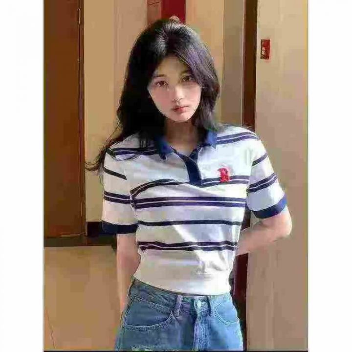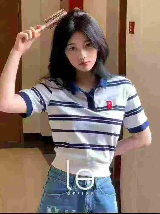 正肩短袖t恤女短款辣妹小众条纹翻领polo衫,独立包装,后领包边,重工刺绣,码数1-5点(S-2XL),数量616件,分货加1,货号109#17