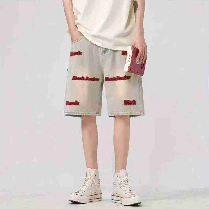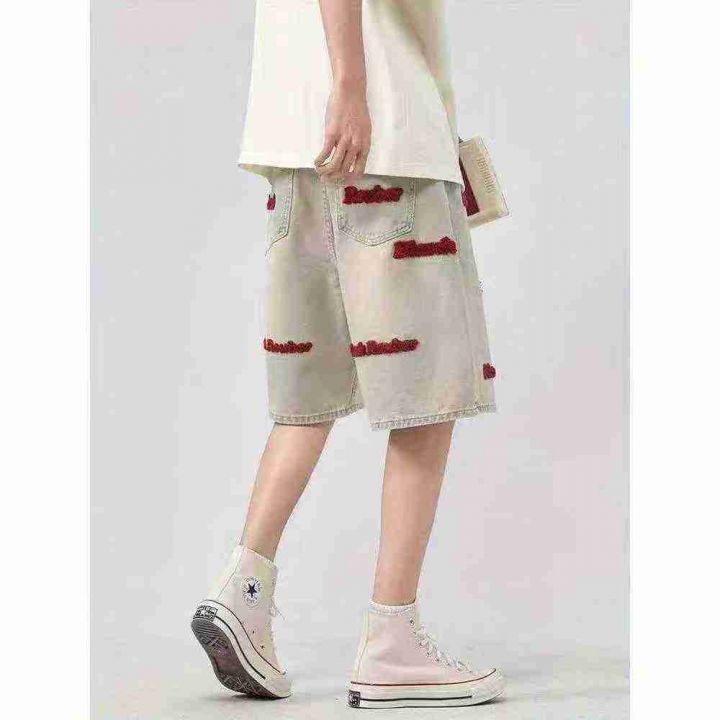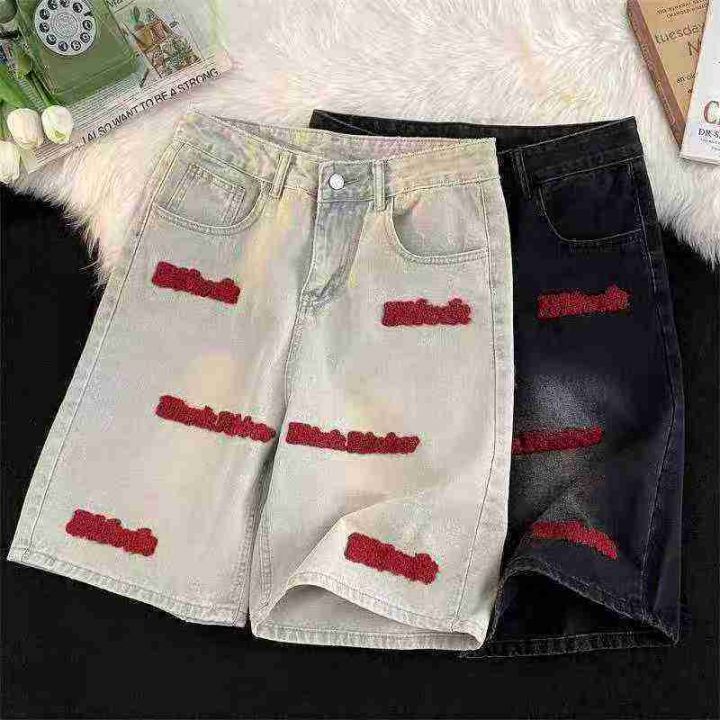 美式男夏季vibe设计感红色刺绣直筒宽松牛仔短裤 数量185件左右 尺码S--3XL 黑色为主(蓝色只有几条) 独立包装带吊牌 货品干净整洁