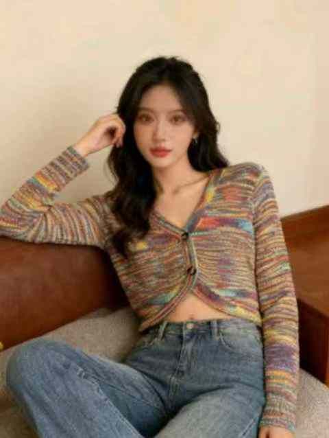 秋季新品宽松花纱撞色彩虹超好看针织毛衣毛衣开衫,独...