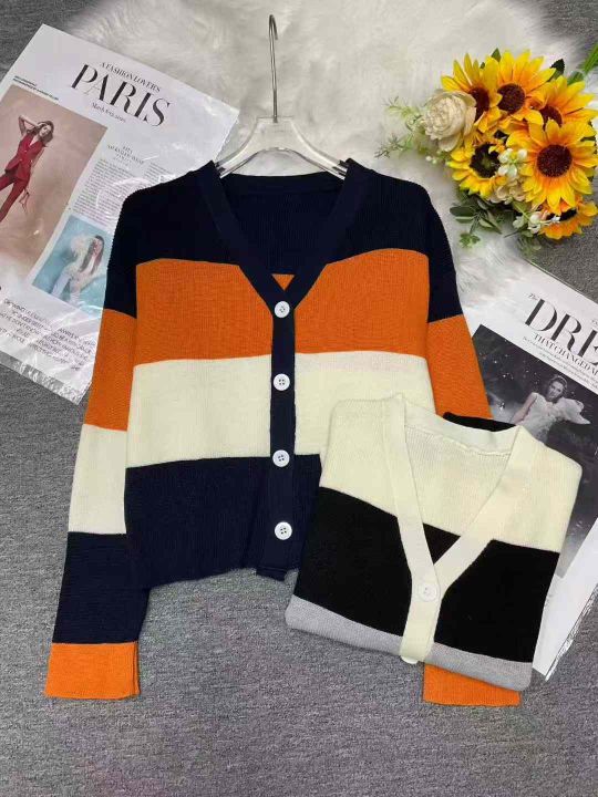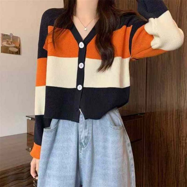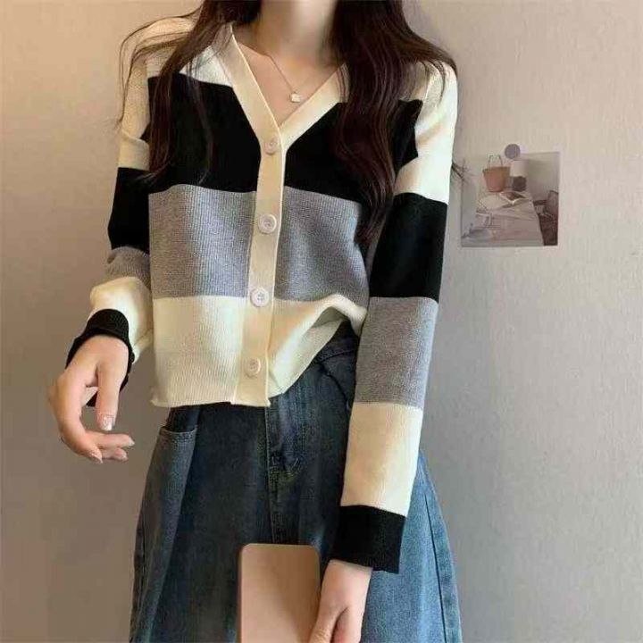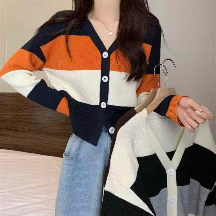秋冬新款宽松慵懒风百搭撞色条纹针织毛衣开衫,独立包...