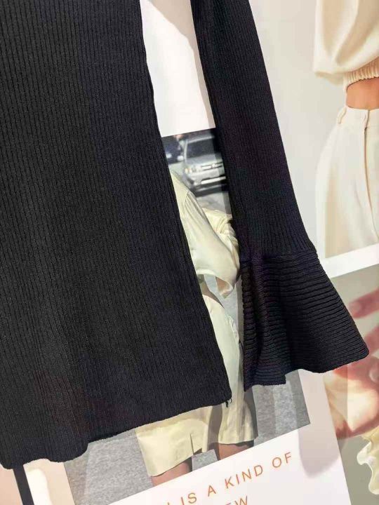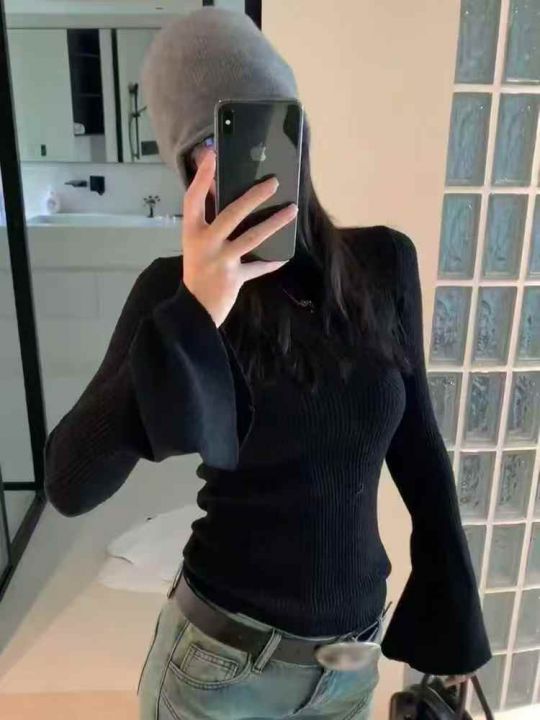 73件韩系靓妹款黑色圆领喇叭袖包芯纱针织衫女早秋小个...