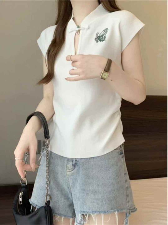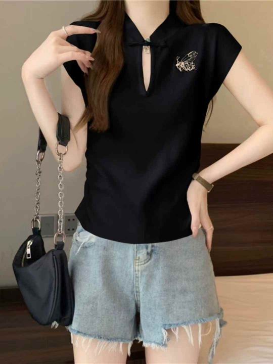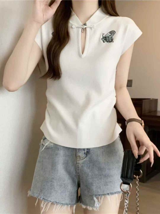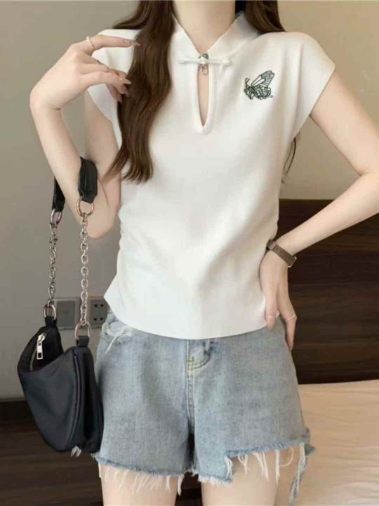 夏季新款冰丝刺绣弹力修身显瘦新中式国风气质针织衫,...