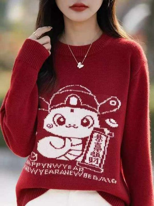 秋冬新款大码女装显瘦新年红圣诞卡通提花减龄设计感加厚套头毛衣,独立包装...