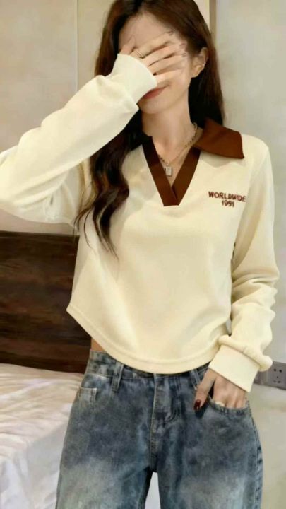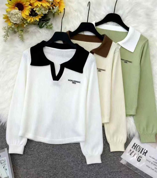 秋季新品撞色刺绣字母小清新百搭polo领针织套头毛衣,...