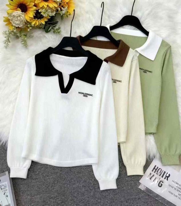 秋季新品撞色刺绣字母小清新百搭polo领针织套头毛衣,...