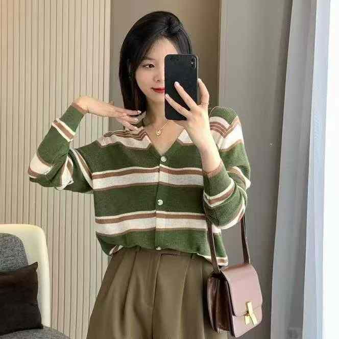 秋冬新款复古条纹撞色气质显瘦高级感针织毛衣开衫,独...