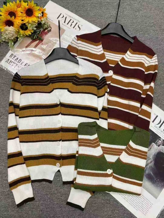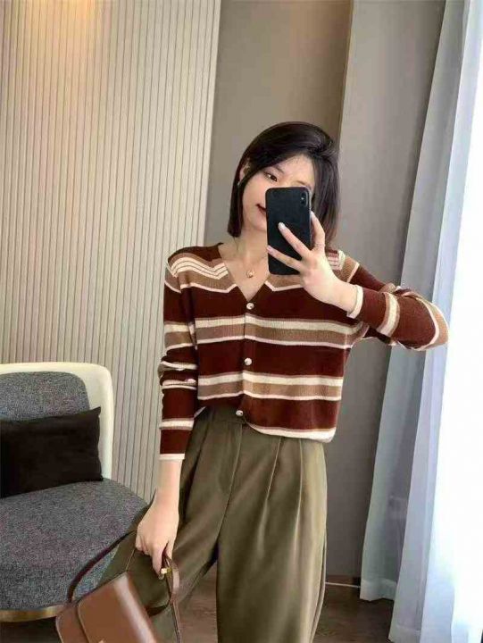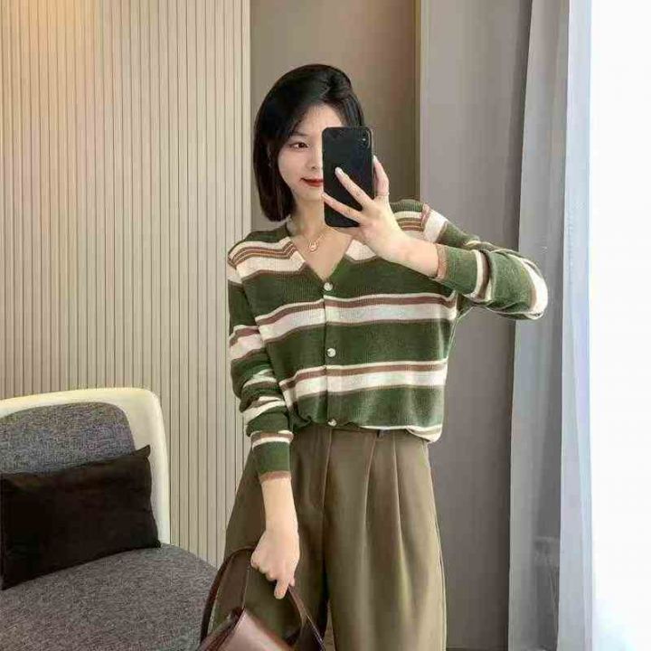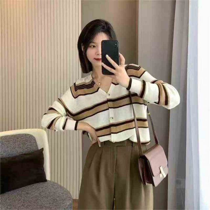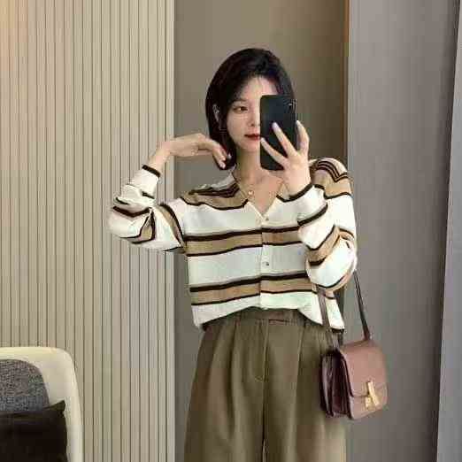 秋冬新款复古条纹撞色气质显瘦高级感针织毛衣开衫,独...