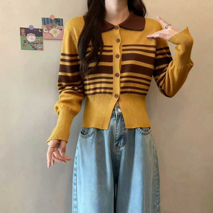 秋装新款设计感撞色洋气韩版polo领别致针织毛衣开衫,...