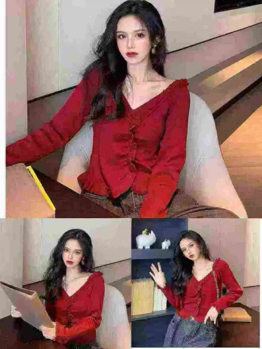 早秋流行穿搭v领毛衣针织长袖小衫上衣,独立包装,均...