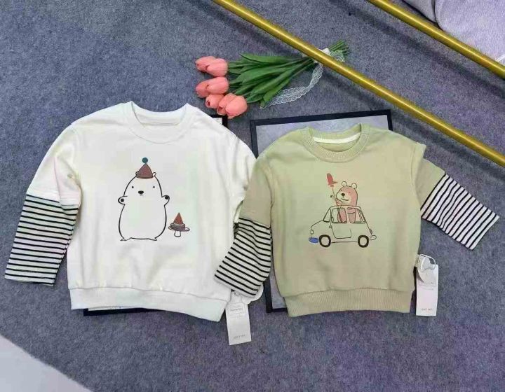 全清5.9,母婴店下架春装宝宝洋气时髦超萌卡通假两件纯棉T恤卫衣,如图1图2整款两个图案两个色,全部原高品质独立包装吊牌,码数80到130,共3000件左右,分货+1