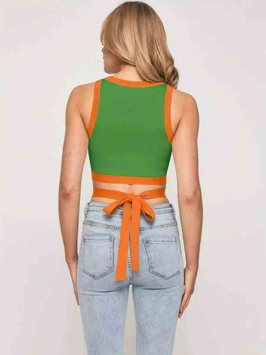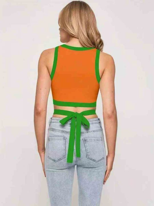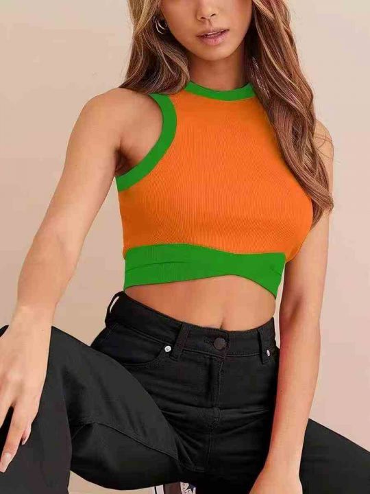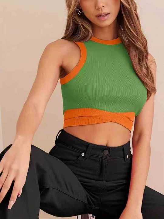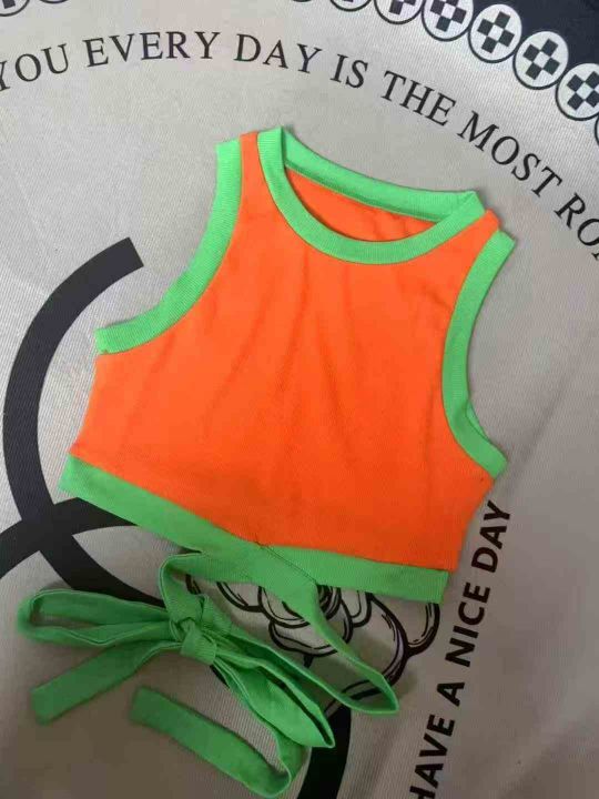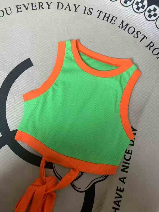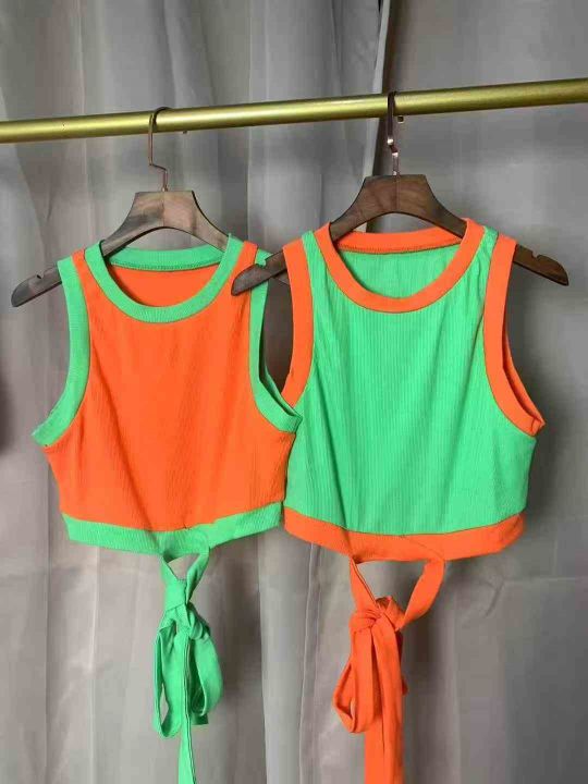 3.8清214件 夏季热卖新品拼接色女装超短款性感时尚小背心螺纹绑绳露脐装 码数S--XL 独立包装