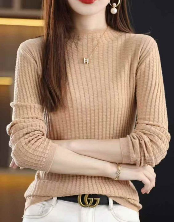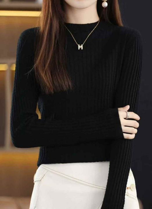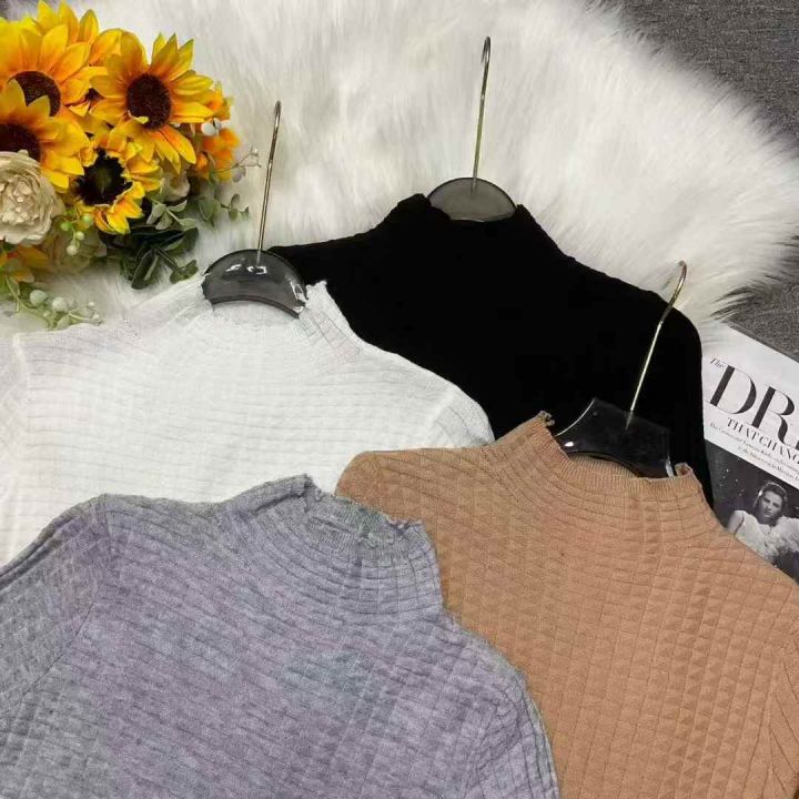 秋冬新款半高领薄款华夫格精纺设计感内搭打底针织衫,...