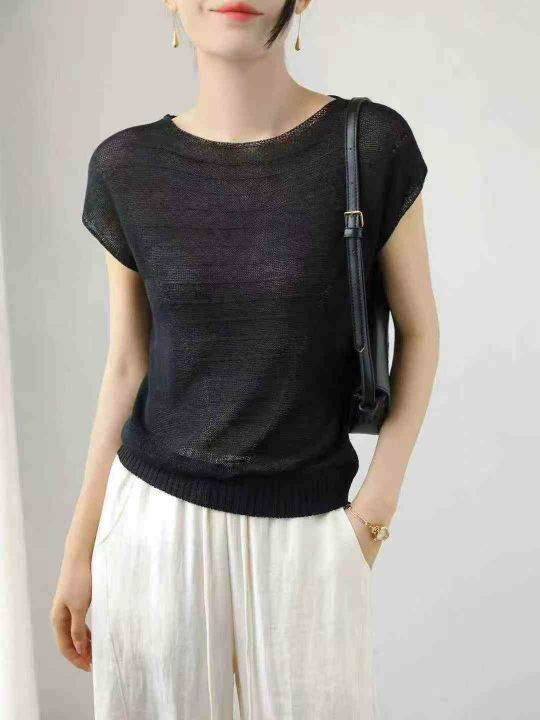 镂空和纸纱坎肩套头针织T恤衫女夏通勤外穿短袖打底轻薄上衣,独立包装,105...