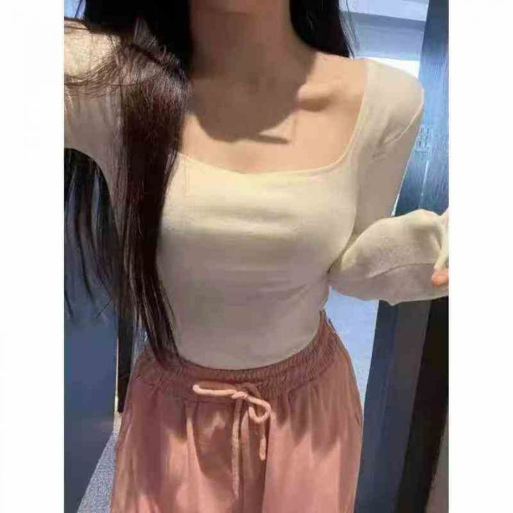 一字肩纯欲小众露肩修身显瘦内搭打底衫百搭褶皱长袖针...