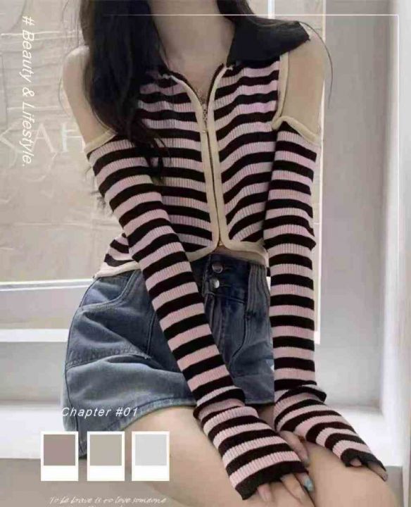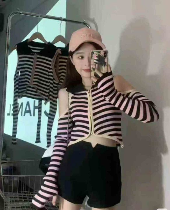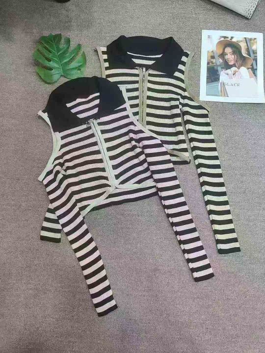 性感露肩条纹针织衫春秋高腰修身显瘦时尚翻领拉链开衫上衣,独立包装,均码,380件,清6.8元,分货加5毛