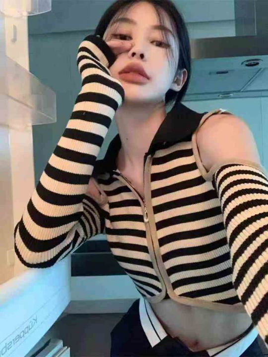 性感露肩条纹针织衫春秋高腰修身显瘦时尚翻领拉链开衫...