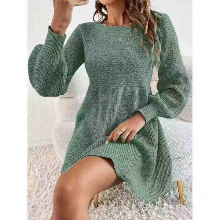 秋冬新欧美风宽松纯色粗针灯笼袖高腰A字圆领毛衣连衣...
