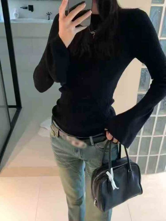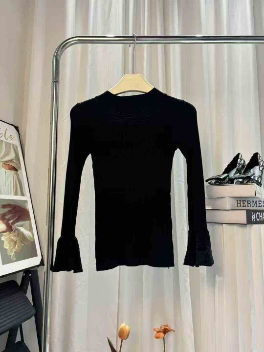 73件韩系靓妹款黑色圆领喇叭袖包芯纱针织衫女早秋小个子修身显瘦内搭气质打底上衣,质量很好!均码!高弹力!独立包装!零瑕疵便宜清4.9 不分货。 货号:1323